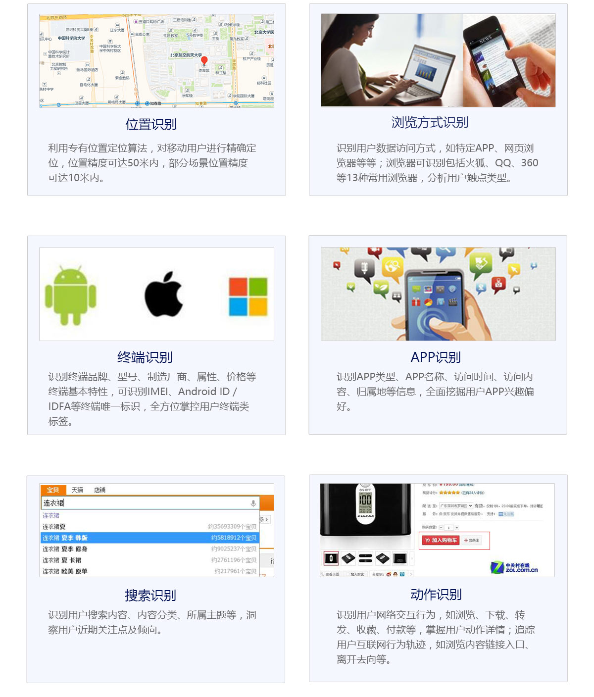 基于Hadoop/Spark架構(gòu)的大數(shù)據(jù)處理平臺(tái),利用數(shù)據(jù)采集平臺(tái)收集的相關(guān)數(shù)據(jù),對(duì)用戶相關(guān)行為進(jìn)行分析、聚類、匯總、統(tǒng)計(jì),最終形成用戶位置識(shí)別、瀏覽方式識(shí)別、終端識(shí)別、APP識(shí)別、搜索識(shí)別、動(dòng)作識(shí)別。