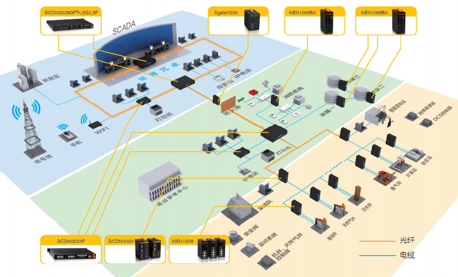 智能化的數(shù)字油氣田建設(shè)需要構(gòu)建一個(gè)安全、高效、可靠的自動(dòng)化網(wǎng)絡(luò),以提高油田生產(chǎn)、強(qiáng)化生產(chǎn)過(guò)程控制、輔助生產(chǎn)管理等。通過(guò)有線光纖傳輸網(wǎng)絡(luò)和無(wú)線傳輸網(wǎng) 絡(luò),實(shí)現(xiàn)油氣田井區(qū)、計(jì)量間、集輸站、聯(lián)合站、處理廠之間的生產(chǎn)數(shù)據(jù)、設(shè)備狀態(tài)信息實(shí)時(shí)傳輸、共享。并可在作業(yè)區(qū)生產(chǎn)指揮中心及生產(chǎn)控制中心進(jìn)行集中管理 和控制。由于網(wǎng)絡(luò)系統(tǒng)承載了視頻監(jiān)控、采集數(shù)據(jù)和控制數(shù)據(jù),因此,一個(gè)高帶寬,具有優(yōu)良的冗余性、安全性、實(shí)時(shí)性和可靠性的骨干網(wǎng)絡(luò)成為油田自動(dòng)化的主要需求。