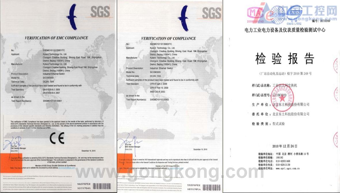 2010年12月23日 Sicom3009卡軌式網(wǎng)管型工業(yè)以太網(wǎng)交換機(jī)順利取得由SGS公司測試并認(rèn)證的CE/FCC報(bào)告;并在同時(shí)間取得電力工業(yè)電力設(shè)備及儀表質(zhì)量檢驗(yàn)測試中心的型式試驗(yàn)報(bào)告。