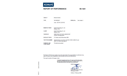 東土自主研發(fā)的SICOM3024P系列工業(yè)以太網(wǎng)交換機(jī)在荷蘭KEMA 公司本部順利通過了基于 IEC 61850和 IEEE 1613標(biāo)準(zhǔn)所進(jìn)行的各項(xiàng)檢測(cè)和認(rèn)證。2009年3月27日,東土科技收到了KEMA公司發(fā)來(lái)的書面報(bào)告,東土成為國(guó)內(nèi)首個(gè)通過KEMA認(rèn)證的工業(yè)以太網(wǎng)交換機(jī)生產(chǎn)廠家。