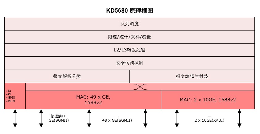 KD5680 包含 48 個(gè) GE 接口、 2 個(gè) 10GE 接 口以及 1 個(gè) GE 管理端口,所有網(wǎng)絡(luò)轉(zhuǎn)發(fā)業(yè)務(wù)均 可在最小 64 字節(jié)報(bào)文情況下達(dá)到 68Gbps 的最 高性能??芍С?L2/L3 交換、IP 單播組播路由、 安全訪問控制 ACL 和流量管理功能,并可支持 多樣靈活的報(bào)文流分類特性以及豐富的管理控制接口。