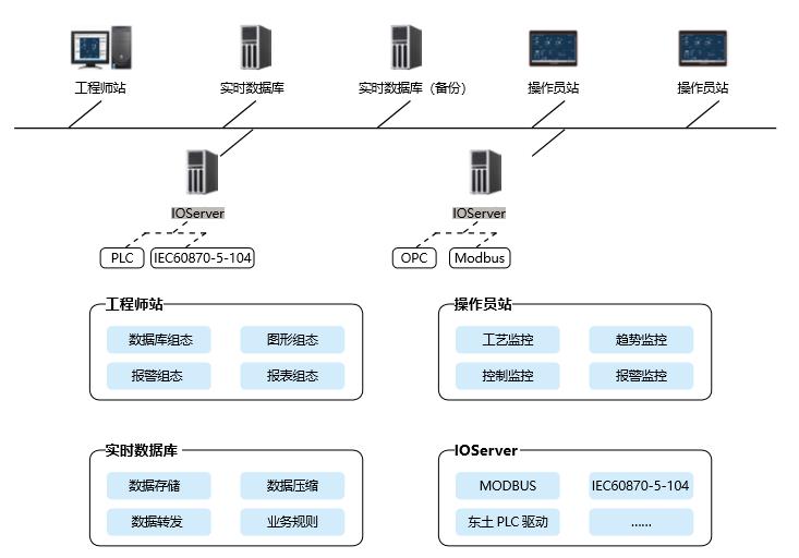 KySCADA工業(yè)互聯(lián)網(wǎng)人機監(jiān)控平臺是東土Intewell工業(yè)互聯(lián)網(wǎng)操作系統(tǒng)的一個重要組成部分,與東土工業(yè)服務器、MaVIEW結(jié)合,為用戶提供軟、硬件一體的工業(yè)現(xiàn)場解決方案。KySCADA通過IOServer接入現(xiàn)場設備將數(shù)據(jù)統(tǒng)一存儲到實時數(shù)據(jù)庫進行合并分析與處理,由實時數(shù)據(jù)庫作為整個系統(tǒng)的核心數(shù)據(jù)交換中心,與工程師站、操作員站、IOServer進行通訊。