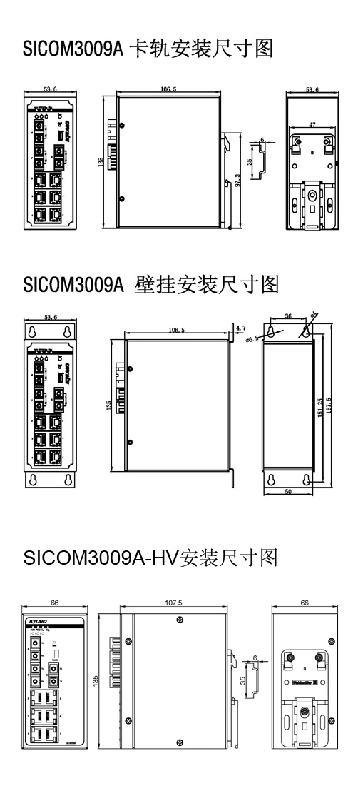 | 機(jī)械結(jié)構(gòu) | 外殼 金屬材質(zhì) 散熱方式 自然冷卻,無風(fēng)扇 防護(hù)等級 IP40 尺寸 53.6mm×135mm×106.5mm(W×H×D) (12/24/48VDC); 66mm×135mm×107.5mm (W×H×D) (220VAC/DC) 重量 0.76Kg 安裝方式 DIN卡軌式或壁掛式 |